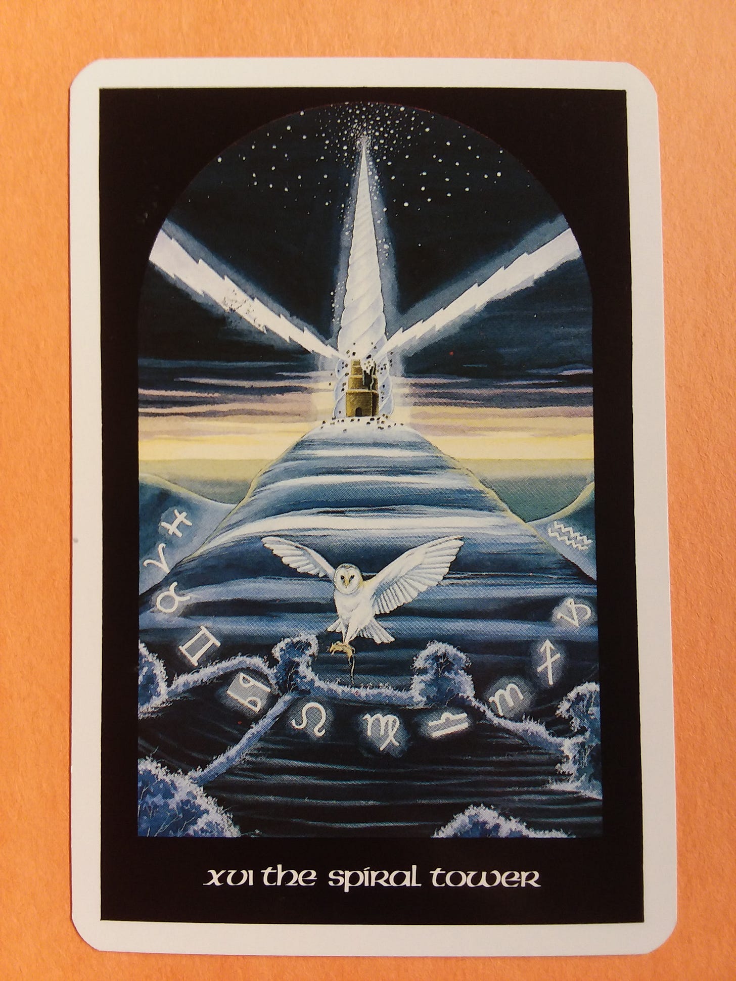 Digging through my fanny pack, I find one of the blank cards is filling in the image of XVI-THE SPIRAL TOWER of the Arthurian Tarot deck, showing the moment the lightning bolts struck.